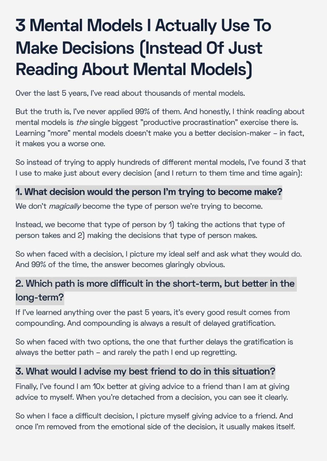 When I happened across these three mental models by Dickie Bush (https://www.dickiebush.com/ I was so impressed I asked him for permission to include them in my post, and he generously agreed. In the future when I have difficult decisions to make, these are the models I will use. How about you?